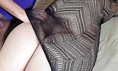 Curvy seductress in fishnet bodystocking tears up her pussy with her pink fuck stick