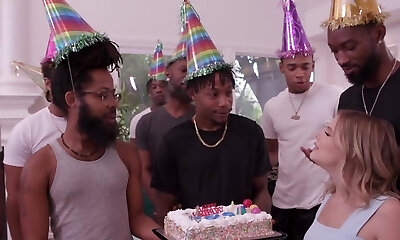 Insatiable blonde housewife, Cammille Austin likes to get down and dirty with three horny dark-hued guys