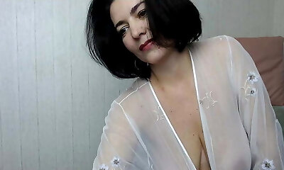 Solo striptease stroking and fingering of horny mature lady with monstrous natural tits